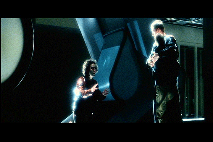 The very first thing I notice about the Picture is the bright light that shines on the characters from the main part of the mall. I think that because there aren't any people around that the phot also suggests they are off in a back room or a closed part of the mall. The man facing Agatha and Anderton seems a little scared but also humbled because he views Agatha as a higher power. In addition to Agatha being able to see the future, this is suggested by him being very short in comparison to Anderton and Agatha. The man's face is in shadow in this picture but his arm is in the light. Because John has come to this man for a helping hand, the man's hand in light may be a representation of the man's willingness to help but the fact that the man's other arm and face are in shadow suggests that his help only extends so far.